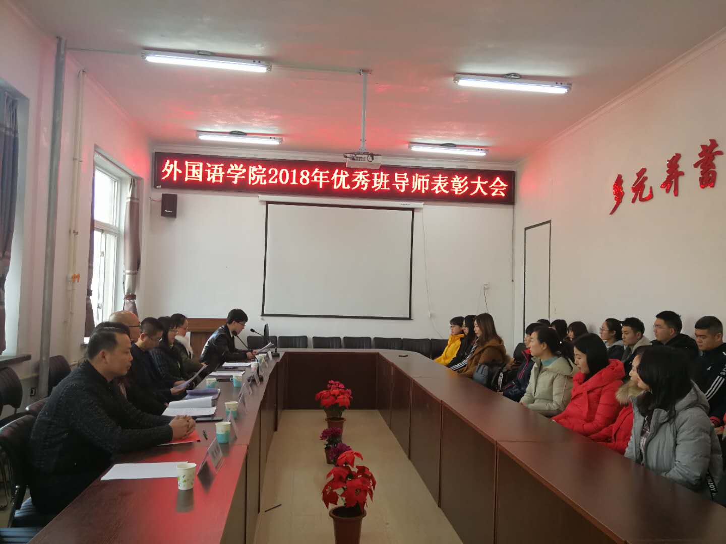 为加强班导师工作队伍建设,提高育人质量和水平,表彰爱岗敬业、为人师表、无私奉献的班导师队伍,1月9日下午,学院召开2018年优秀班导师表彰大会。学生处处长尹忠恺、学院党委书记张慧春、党委副书记张亚男,副院长冯雪、副院长刘艳华、副院长李培培,学院全体辅导员、班导师、班长、团支书出席本次表彰大会。