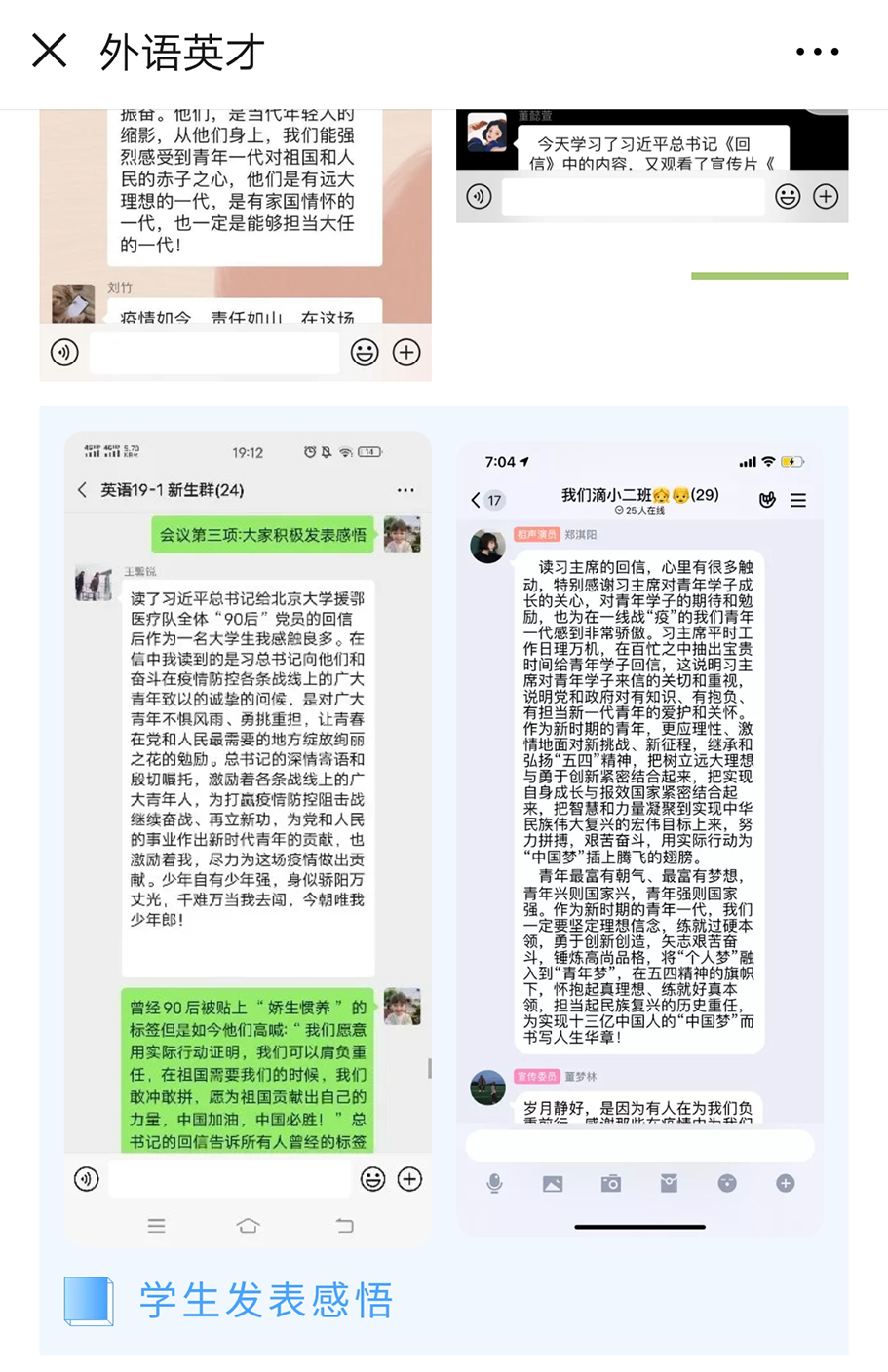团委在4月和5月组织各团支部以习近平新时代中国特色社会主义思想、向抗疫英雄致敬、向学校青年榜样学习为内容,举办“经此一疫•成长”、“向抗疫英雄致敬,做新时代好青年”、“新时代青春”主题团会活动,活动以观看宣传片、录制视频、撰写观后感、谈感想等方式进行。了解奋战在疫情前线的青年人以自己的力量参与疫情防控阻击战的奉献。学习疫情防控一线如钟南山、蒋桂喜等抗疫英雄事迹和我校优秀共青团员、青年五四奖章等荣誉获得者的青年榜样奋斗历程。深刻领悟习近平总书记给北京大学援鄂医疗队全体“90 后”党员的回信和习近平总书记五四寄语精神,体悟总书记对青年人担当新时代使命的希望。