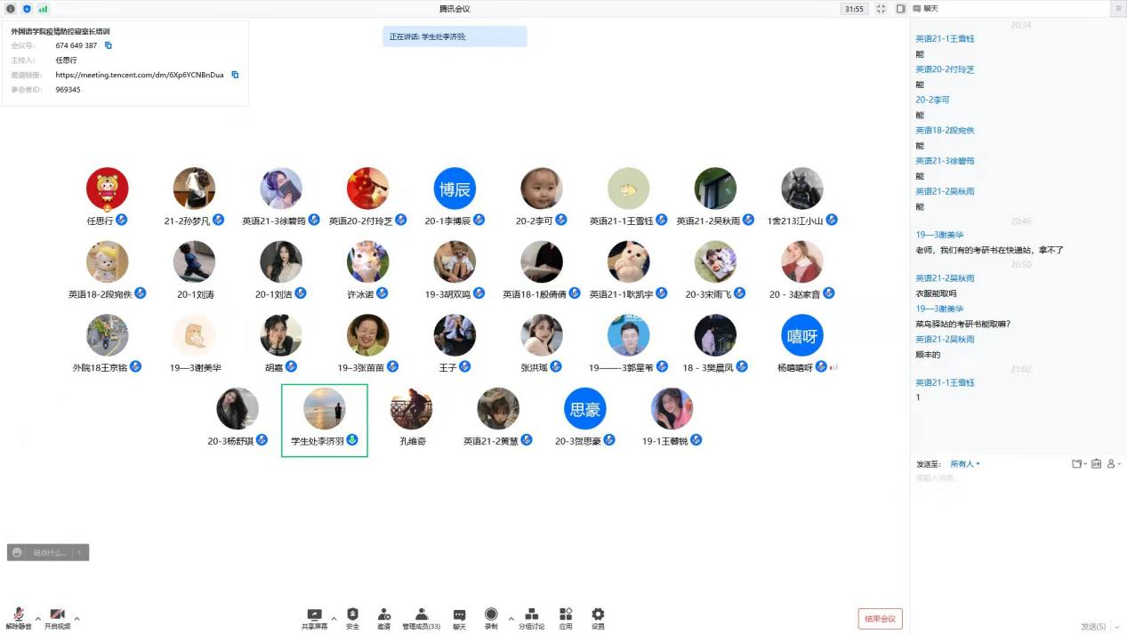 首先,李济羽老师详细说明了我校目前疫情防控的总体情况,包括在疫情期间关于学生用餐、洗浴、自习的安排等与学生日常生活息息相关的事项。