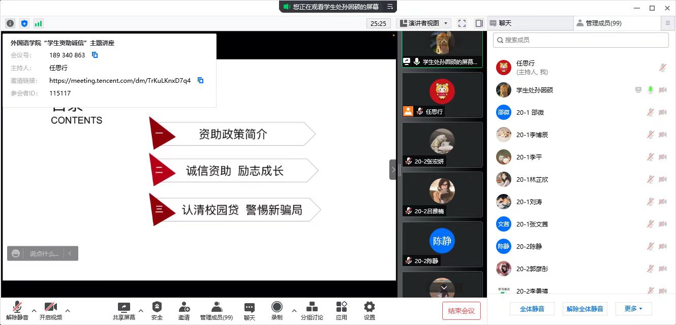 于5月5日18点通过腾讯会议线上的方式组织开展了学生资助诚信教育主题讲座。此次讲座由学生处学生资助中心主任孙囡硕主讲,参加此次讲座的有九秀直播