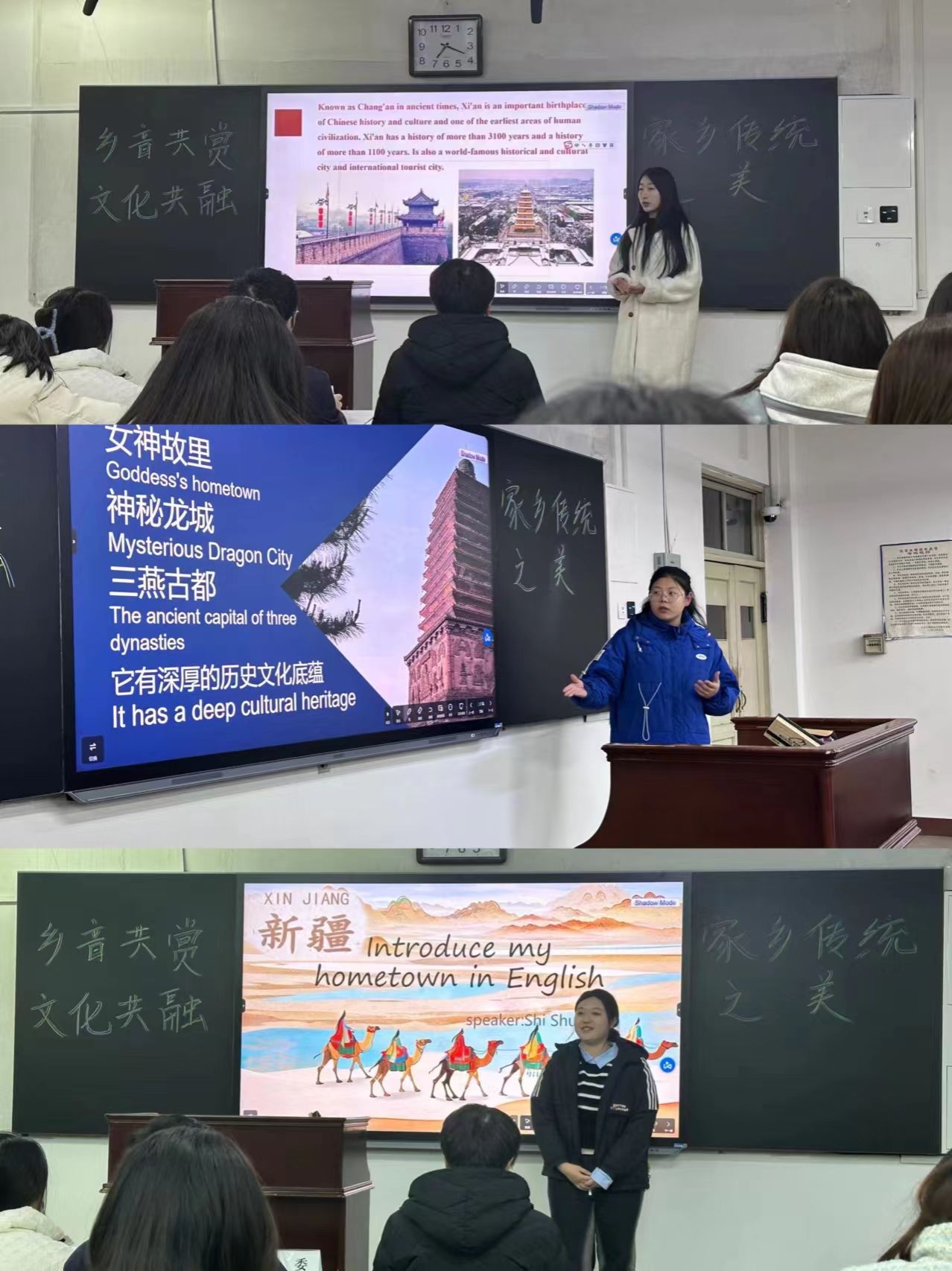 比赛中,参赛选手们仪态大方,语言流畅,用英语从自己家乡的文化历史、美食、特色建筑等进行解读,生动诠释了自己对家乡、对英语演讲的热爱,充分展示了对乡音文化共融的深刻理解。其中,五号选手王硕介绍了她的家乡-朝阳,“中华龙鸟起飞的地方”,选手从民俗活动,遗迹,美食三个方面展开,讲述了红山文化和马鞍山遗址的悠久历史。九号选手赵金洋介绍了她的家乡-西安:上千年的历史跨度,六千年的暮鼓晨钟,青砖黛瓦,市井长巷,一半是历史,一半是故事,这是西安亦是长安,选手从各个角度让我们领略到了西安之美。十号选手石烁涵介绍了她的家乡-新疆:“明月出天山,苍茫云海间”选手用丝绸之路引入话题,这是一条包含多样文化,源自中国,属于世界的地方,并分别从新疆的文化、美食进行阐述,让我们领略了新疆之美。各位选手们的精彩演讲让我们理解了家乡文化互融的重要意义和对中华传统文化的挖掘。