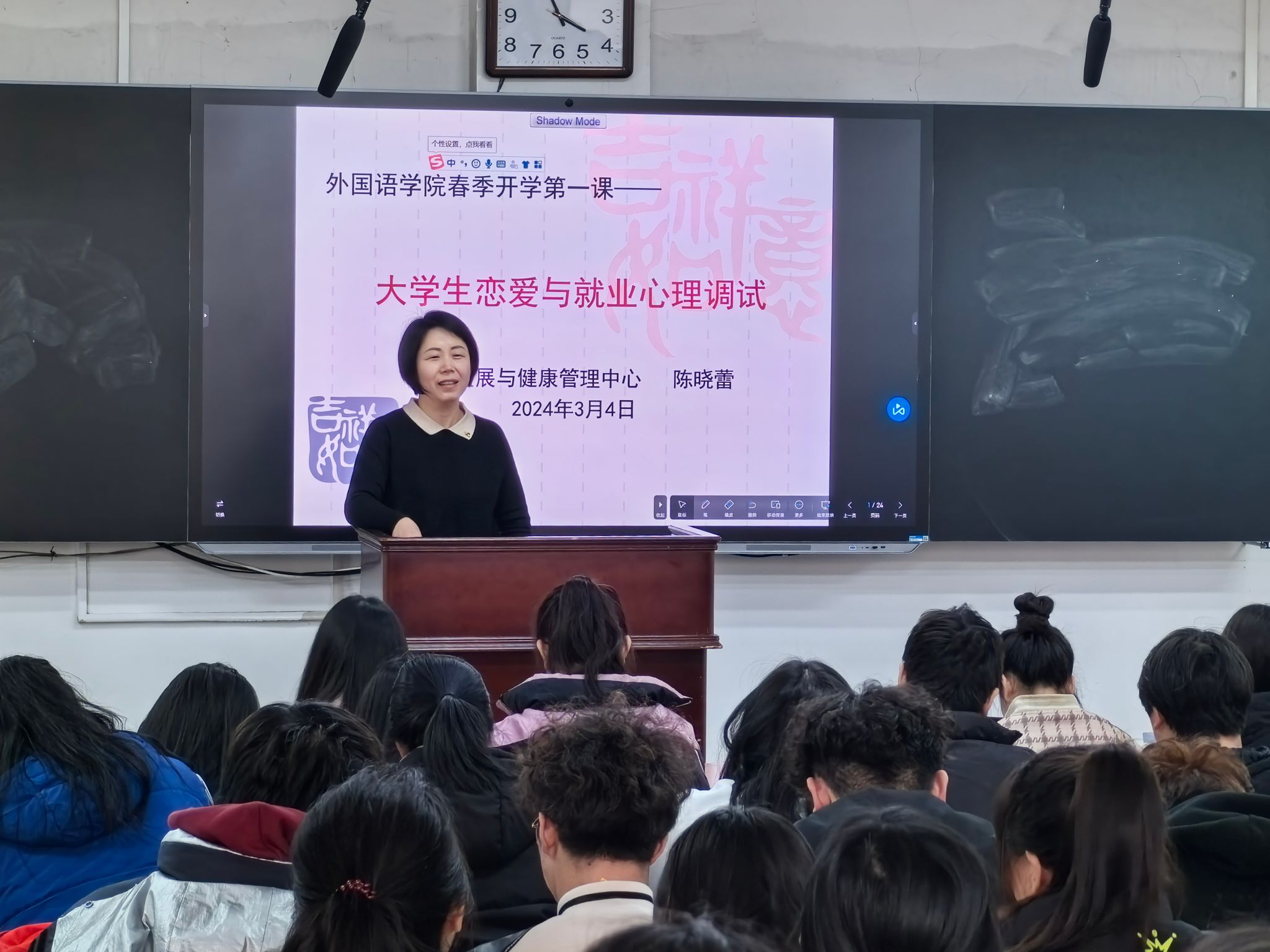 于3月4日在新华楼206举办了主题为“大学生恋爱就业心理调试”的心理讲座,本次讲座由心理发展与健康管理中心陈晓蕾副主任主讲,学院辅导员杨雯雯主持,2023级全体学生参加。
