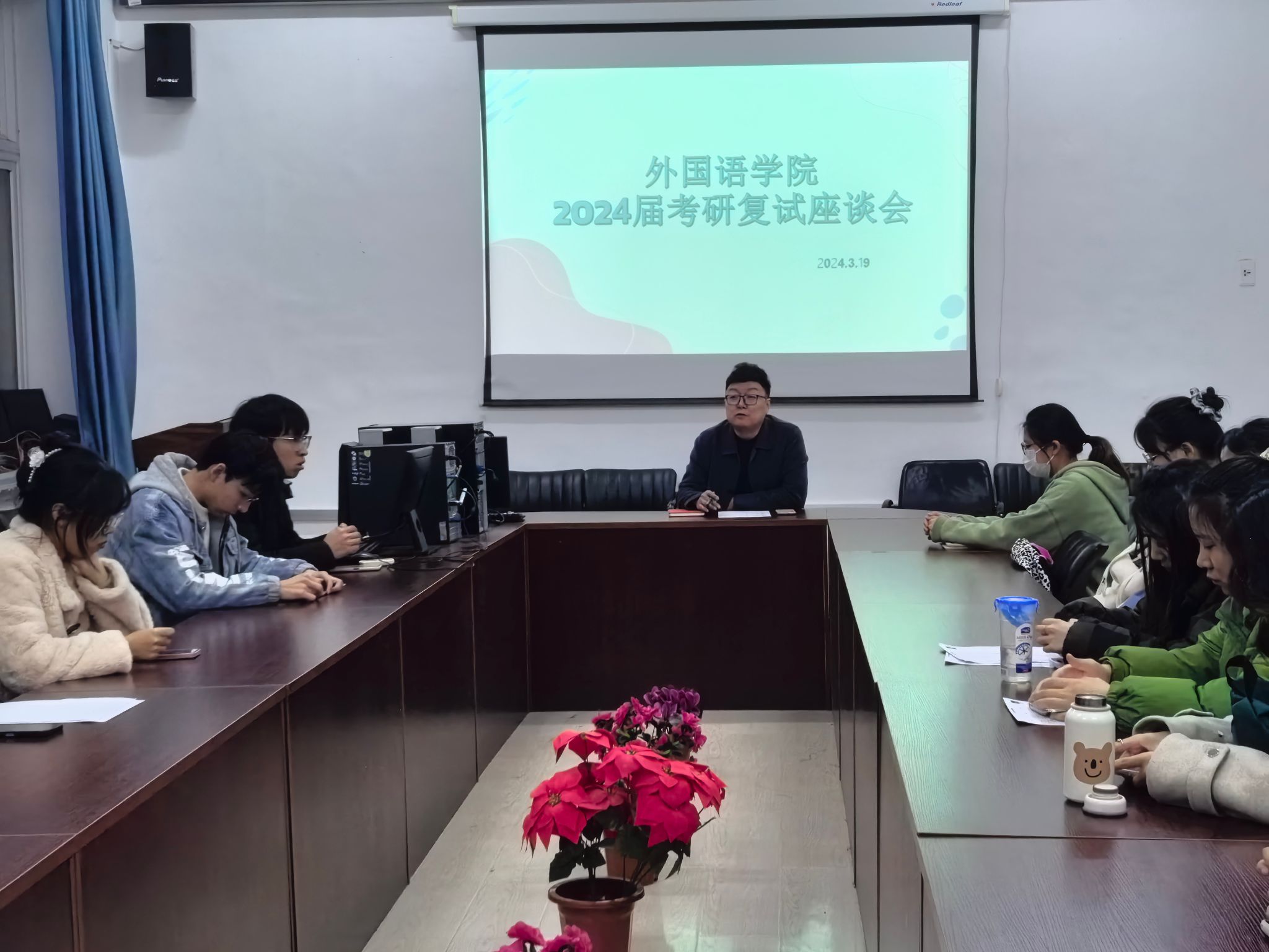 于3月19日,在知行楼二楼会议室召开了考研复试座谈会。本次座谈会由学院党委副书记杨洋主讲,辅导员杨雯雯主持,全体准备复试学生参加。