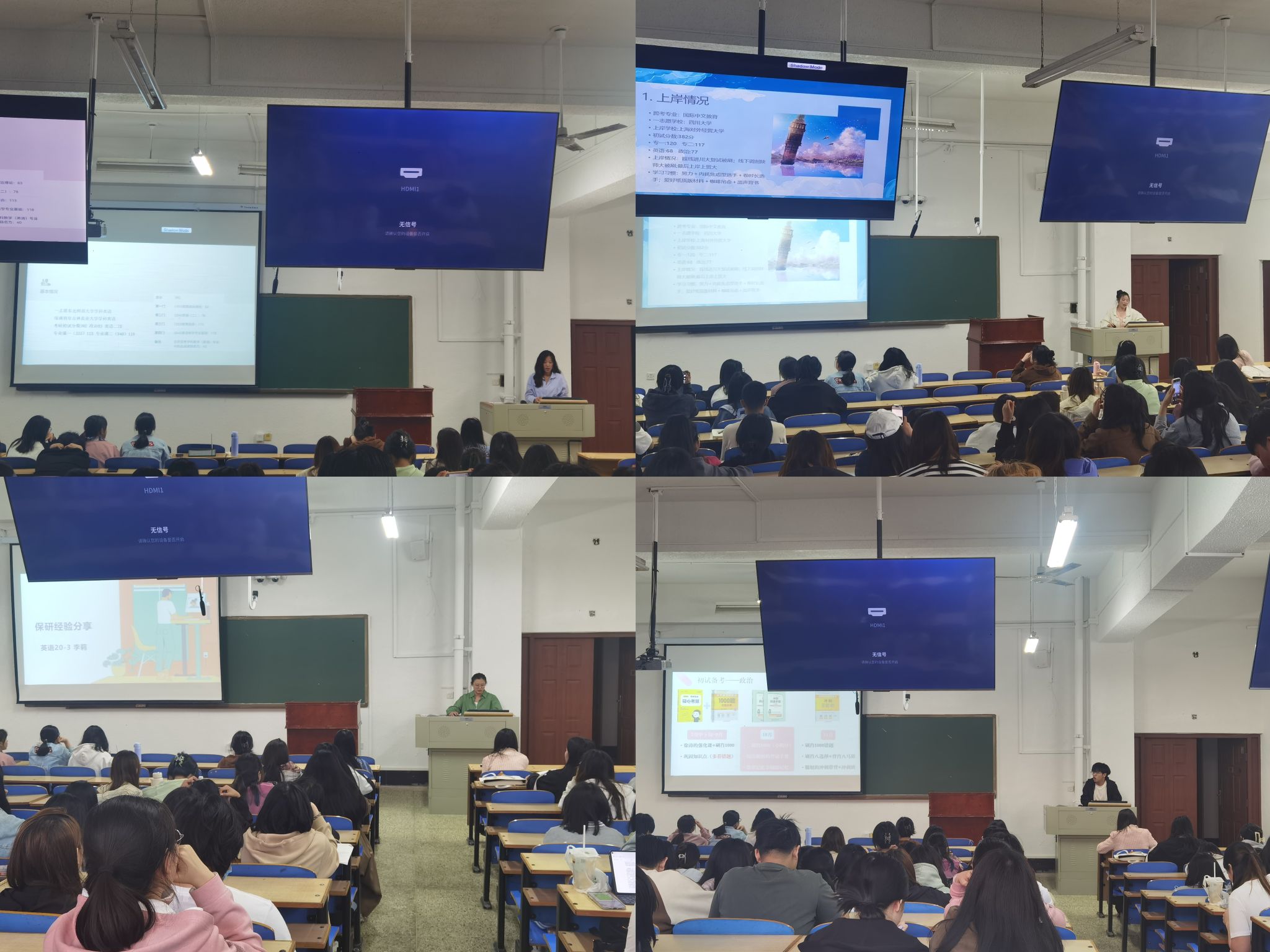 罗浩首先介绍了考研一定要选择专业对口、专业招生人数较多、专业课统考的学校,这样更方便于备考、调剂和院校选择。然后,他就自己的备考经历详细地向大家讲述了自己如何备考和复习各个学科,为低年级学生推荐了实用的学习APP和资料等。李莉为大家讲述自己大学四年来参加竞赛的情况,平时要多准备文书、勤练口语、多看多记专业知识。同时,她也分享了自己在大三下学期参加夏令营的经历,以及夏令营对保研的益处。周燚着重为大家分析要从地区、笔试和面试考试特点等几方面选择目标院校。告诫大家在专业课的复习上一定要注重复习和总结。付婉欣分享了自己的择校、择专业方法以及考研时间线。她提醒要提高收集资料的能力,一定要进行多轮复习,不要只着重刷错题,并推荐了自己考研时所学习的课程视频资料。