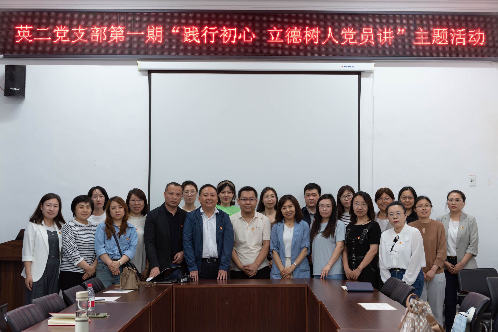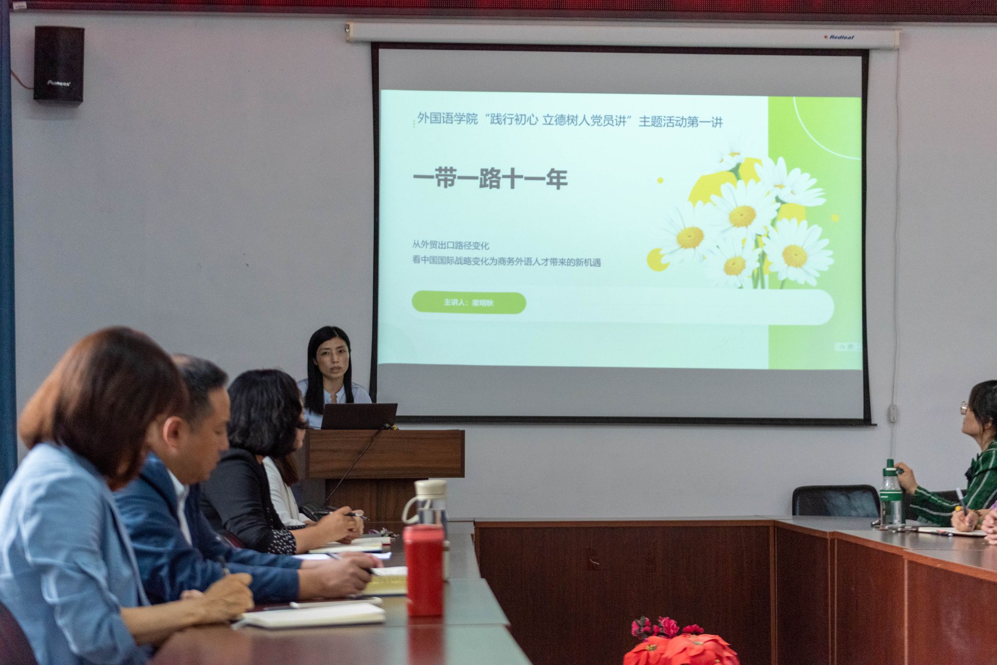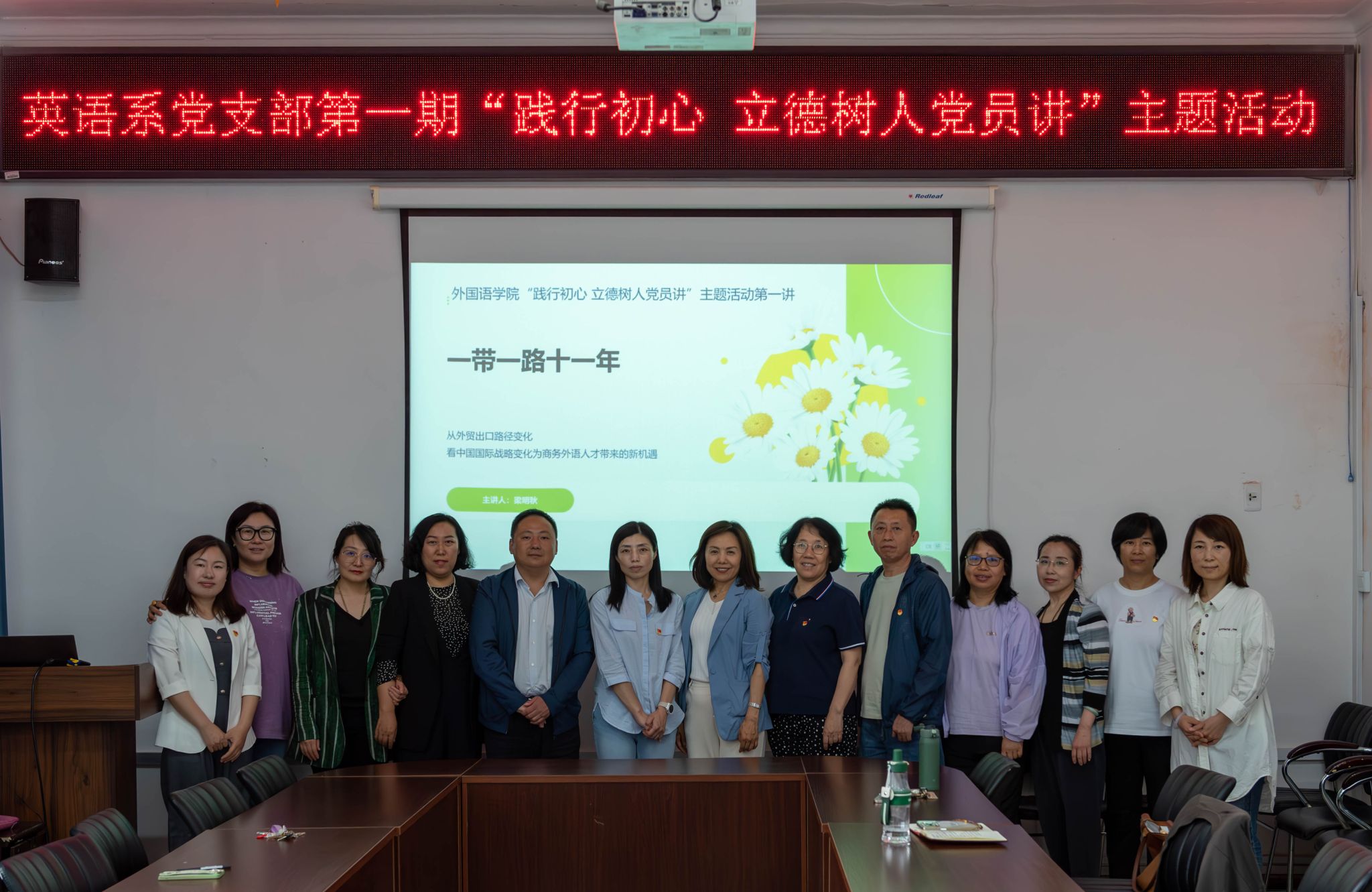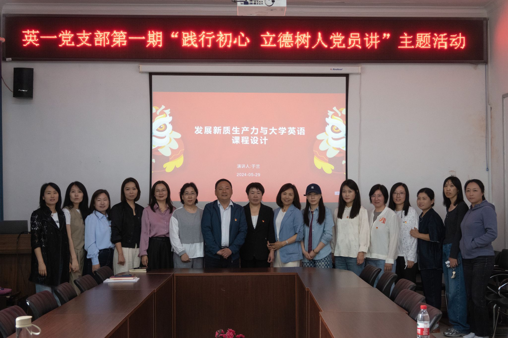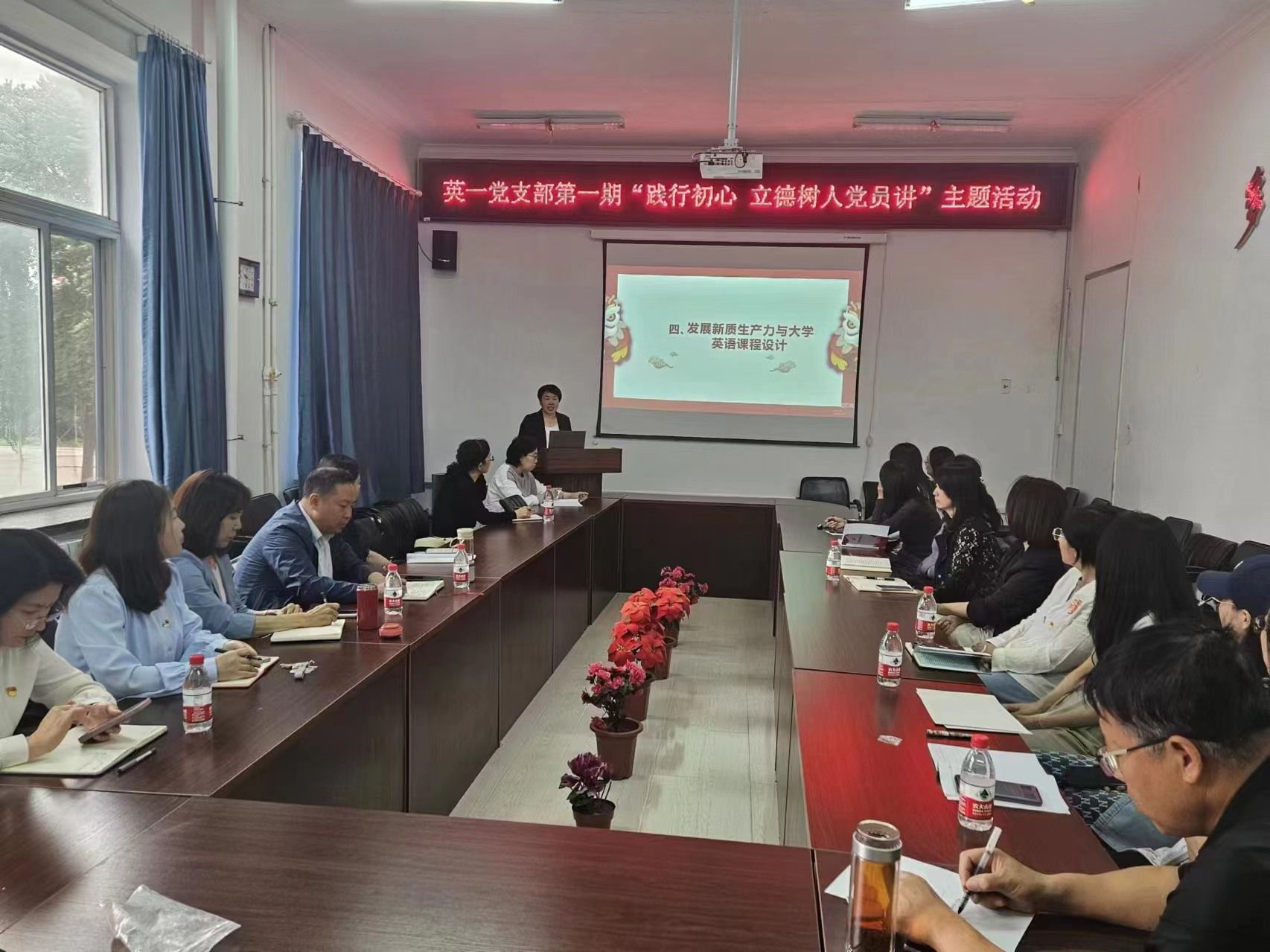 “践行初心 立德树人党员讲”主题活动启动。大学英语第一教学部党支部、大学英语第二教学部党支部、英语系党支部分别开展第一期活动。于兰、王艳平、梁明秋三位老师分别在各自党支部,以“新质生产力”、“环境保护”、“一带一路”为题,为大家带来他们的政治理论学习成果,并进行课程思政教学设计。学院党委书记苏海泉,院长王丽,副院长冯雪、范洪涛,组织员宋红雪参加活动。与会老师共同探讨课程思政元素和教学心得,应用于外语教学。