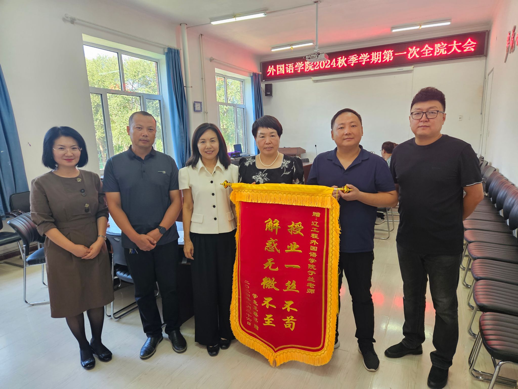 会上,院长王丽代表学院班子向大学英语第一教学部主任于兰老师转送学生王琳淇敬献的写有“解惑无微不至,授业一丝不苟”的锦旗,并号召全院教职工向于兰老师学习。