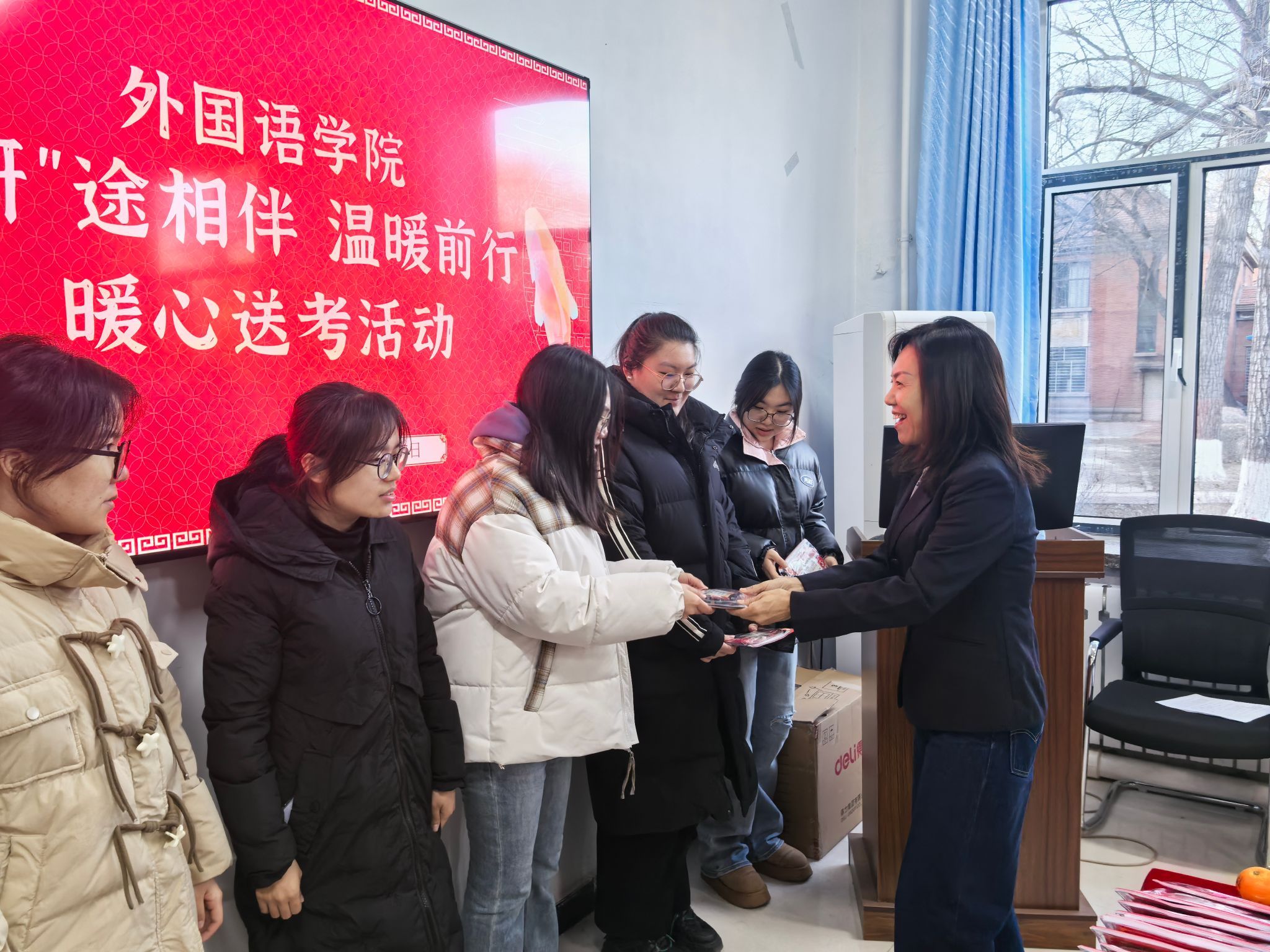 在知行楼114举办了“‘研’途相伴,温暖前行”暖心送考活动。此次活动由学生工作部杨雯雯主持,学院院长王丽、党委副书记杨洋、副院长冯雪、团委书记黄秋雨以及全体考研学生参加。