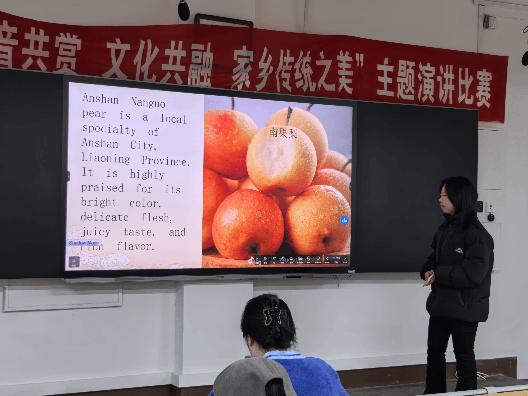 比赛中,杜佳璇、程功、向倚萱、方兰、赵桐萱、陈海萍、蔡世浩、王睿淇八位选手依次登台,分别以辽宁鞍山、吉林、四川南充、辽宁本溪、辽宁沈阳、四川达州、福建福鼎及辽宁阜新八地文化为主题展开演讲。他们通过流利的英语与多媒体展示,生动呈现了家乡的历史底蕴、传统习俗与地域特色:鞍山的工业历史、吉林的雾凇奇观、南充的丝绸文化、本溪的山水风情、沈阳的盛京遗韵、达州的巴人文化、福鼎的白茶制作技艺以及阜新的查海文化等主题轮番登场,为师生带来一场语言与文化的视听盛宴。