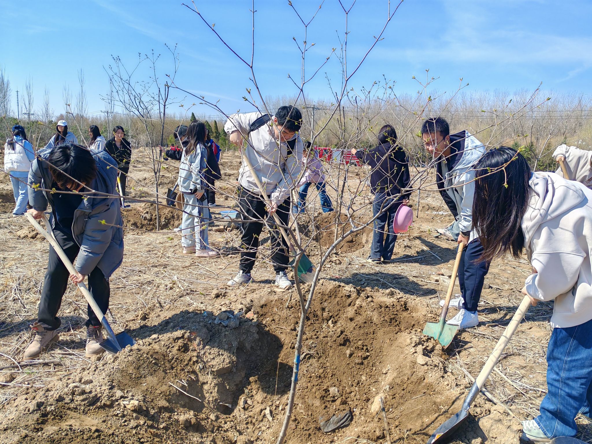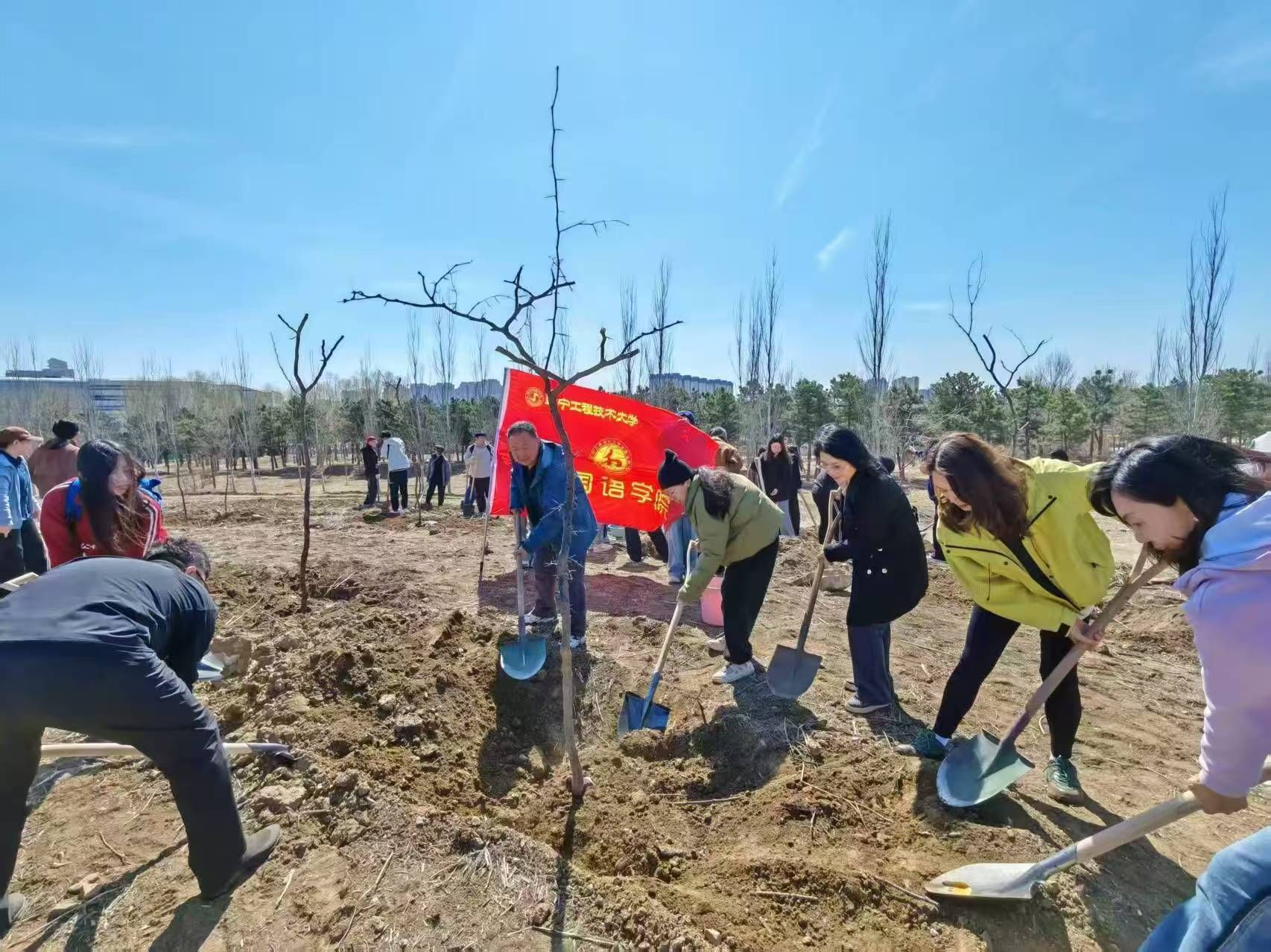 活动现场,师生植树热情高涨,大家分工协作,挥锹铲土、扶苗填坑、培土浇水,共同种下象征希望的树苗,为春日的阜新增添勃勃生机,为建设美丽阜新贡献力量。