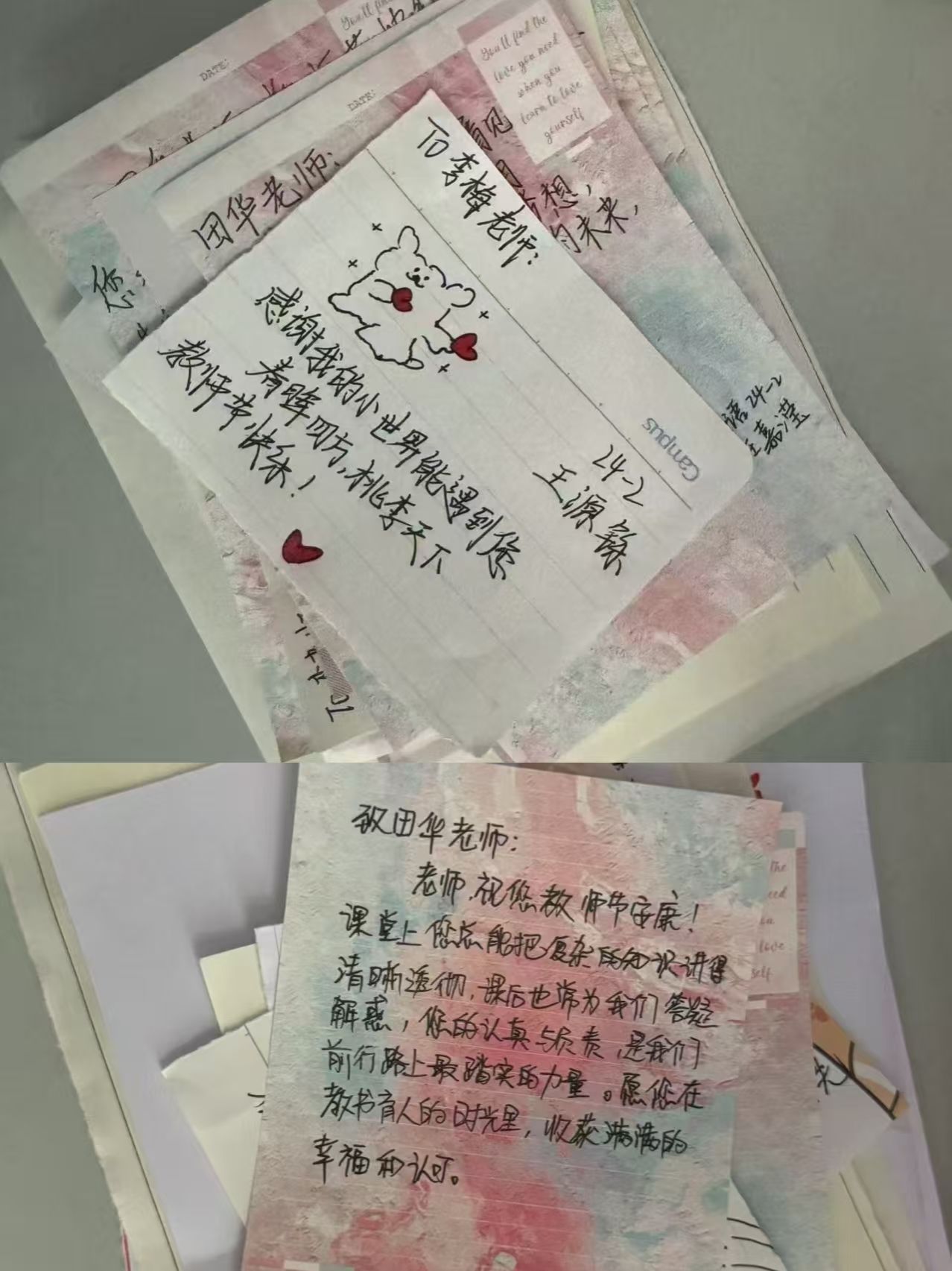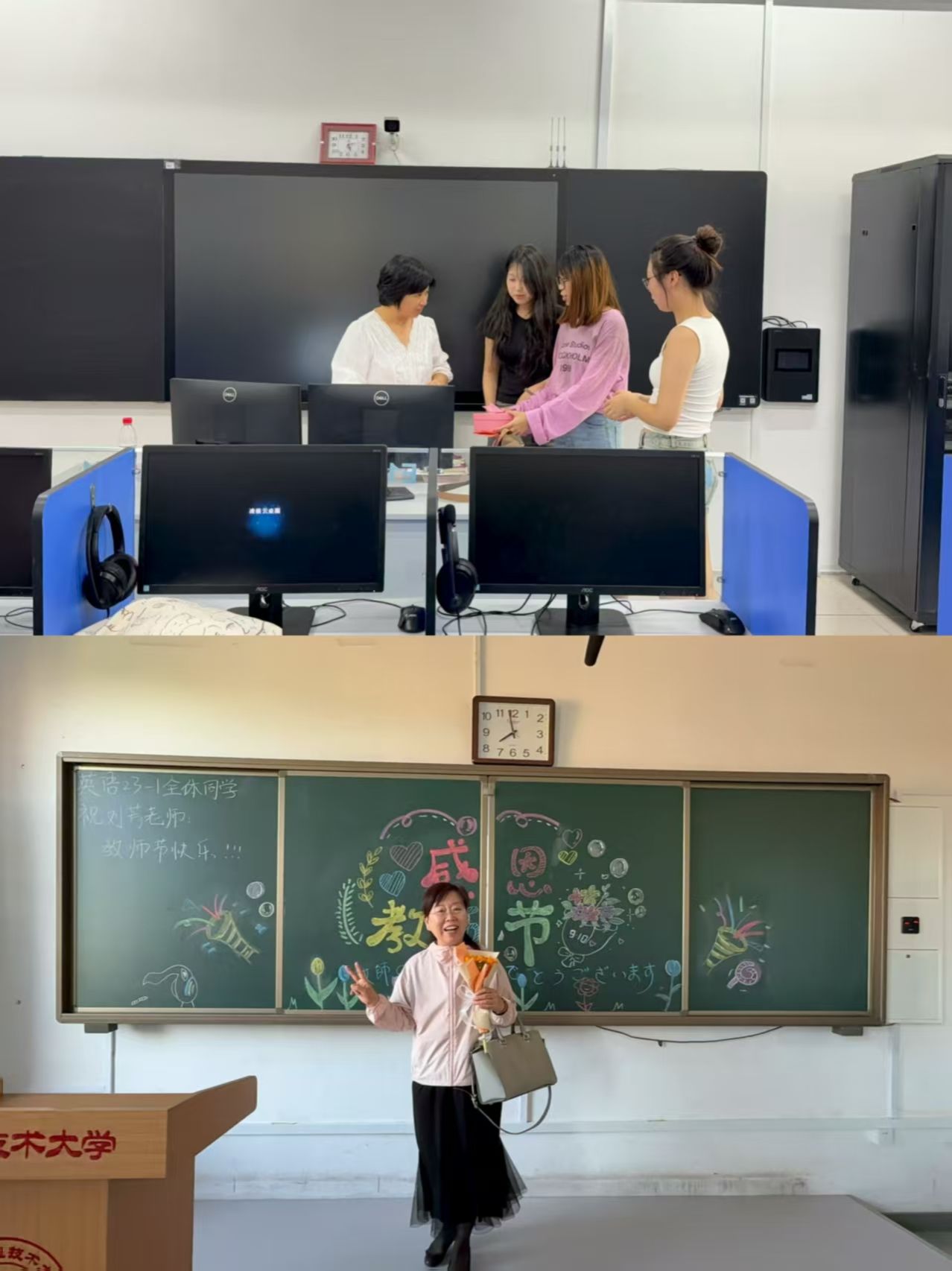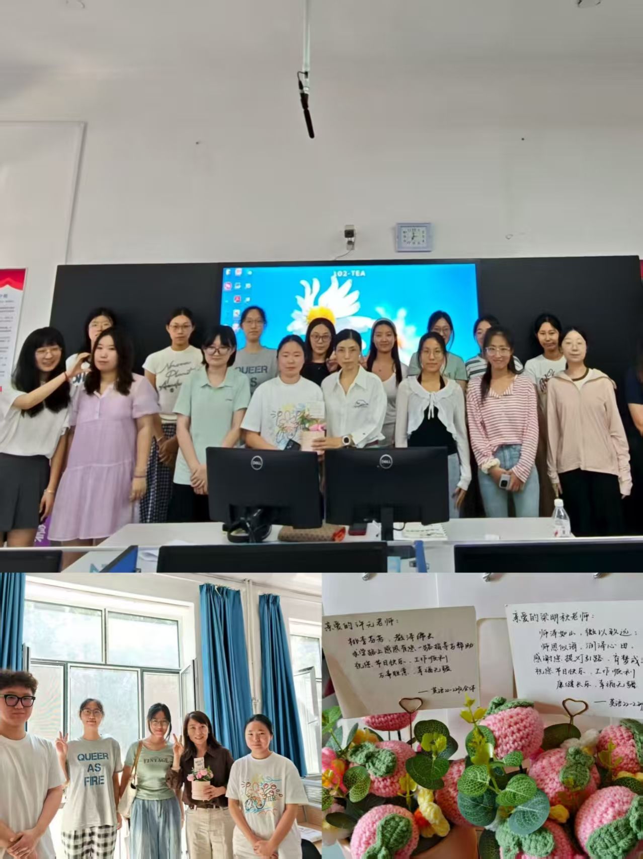 活动中,学生们各展巧思,用真诚传递感恩。大家不仅为老师送上精心挑选的鲜花与手写贺卡,还绘制了一幅幅色彩明快、寓意深刻的黑板报,将对老师的敬爱融入笔墨之间。其中,英语22-2班别出心裁,以手工针织品为载体,借“桃李满天下”的美好寓意,既传递了独一无二的心意,更象征着师生情谊的坚韧绵长;英语23-3班则用实际行动表达感恩,悄悄走进老师办公室,细致打扫卫生、整理物品,为老师们打造出整洁舒适的办公环境;英语24-2班开启“纸条传情”模式,将真挚爱意藏进字里行间;英语24-3班全体学生共同叠制千纸鹤,每一只都承载着对老师的深切祝福。尽管字迹或许稚嫩、语言或许朴素,但字里行间满是学生们最纯粹的感激与热爱,让默默奉献的老师们倍感温暖。