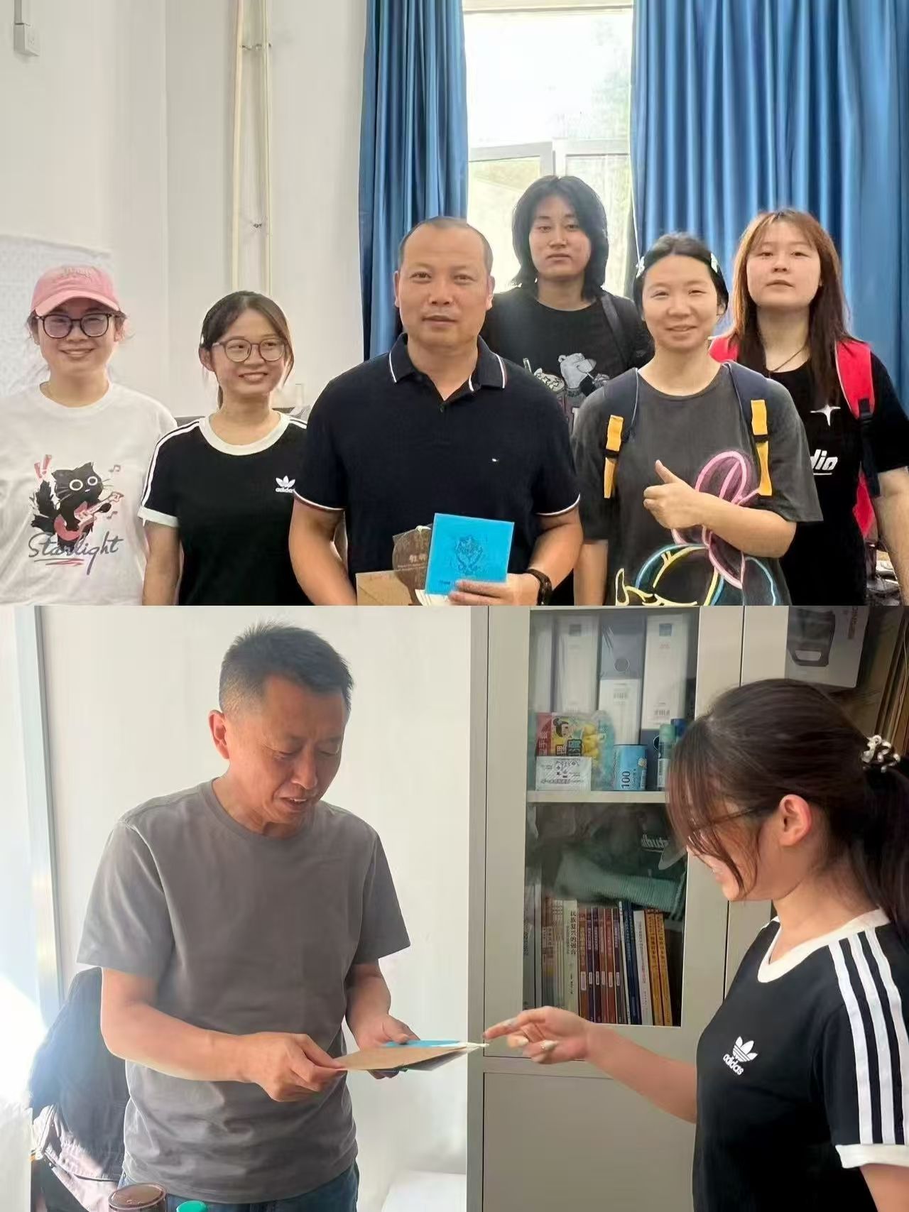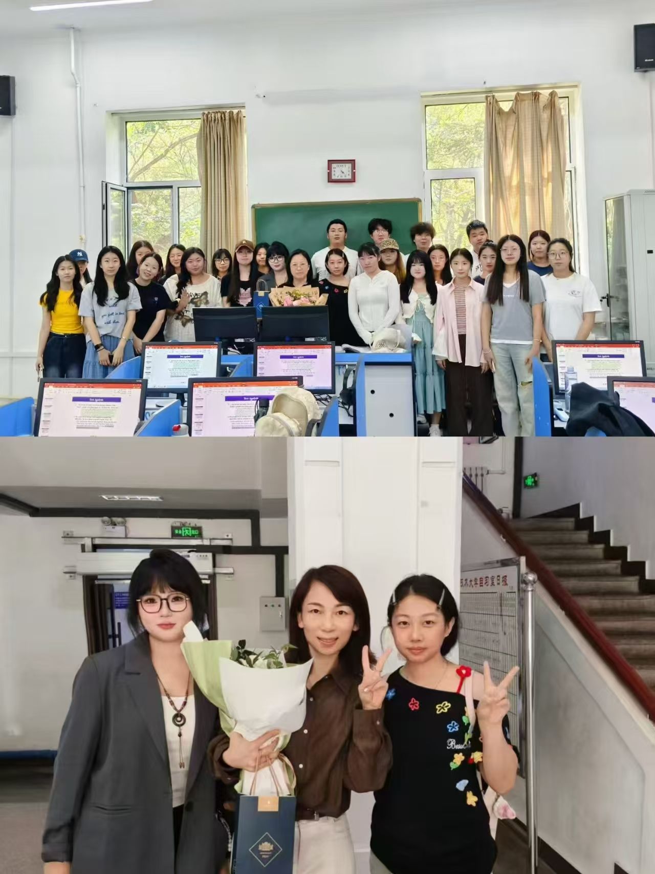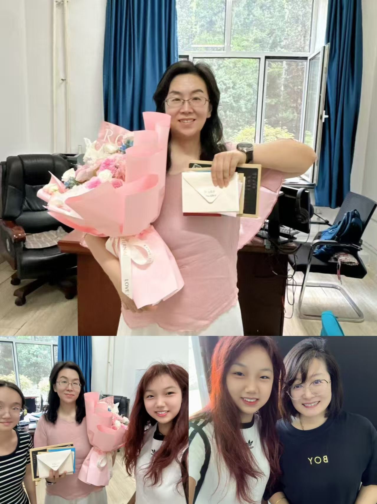 活动中,学生们各展巧思,用真诚传递感恩。大家不仅为老师送上精心挑选的鲜花与手写贺卡,还绘制了一幅幅色彩明快、寓意深刻的黑板报,将对老师的敬爱融入笔墨之间。其中,英语22-2班别出心裁,以手工针织品为载体,借“桃李满天下”的美好寓意,既传递了独一无二的心意,更象征着师生情谊的坚韧绵长;英语23-3班则用实际行动表达感恩,悄悄走进老师办公室,细致打扫卫生、整理物品,为老师们打造出整洁舒适的办公环境;英语24-2班开启“纸条传情”模式,将真挚爱意藏进字里行间;英语24-3班全体学生共同叠制千纸鹤,每一只都承载着对老师的深切祝福。尽管字迹或许稚嫩、语言或许朴素,但字里行间满是学生们最纯粹的感激与热爱,让默默奉献的老师们倍感温暖。