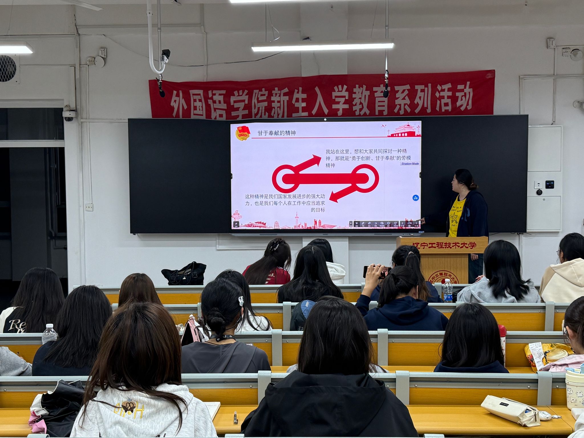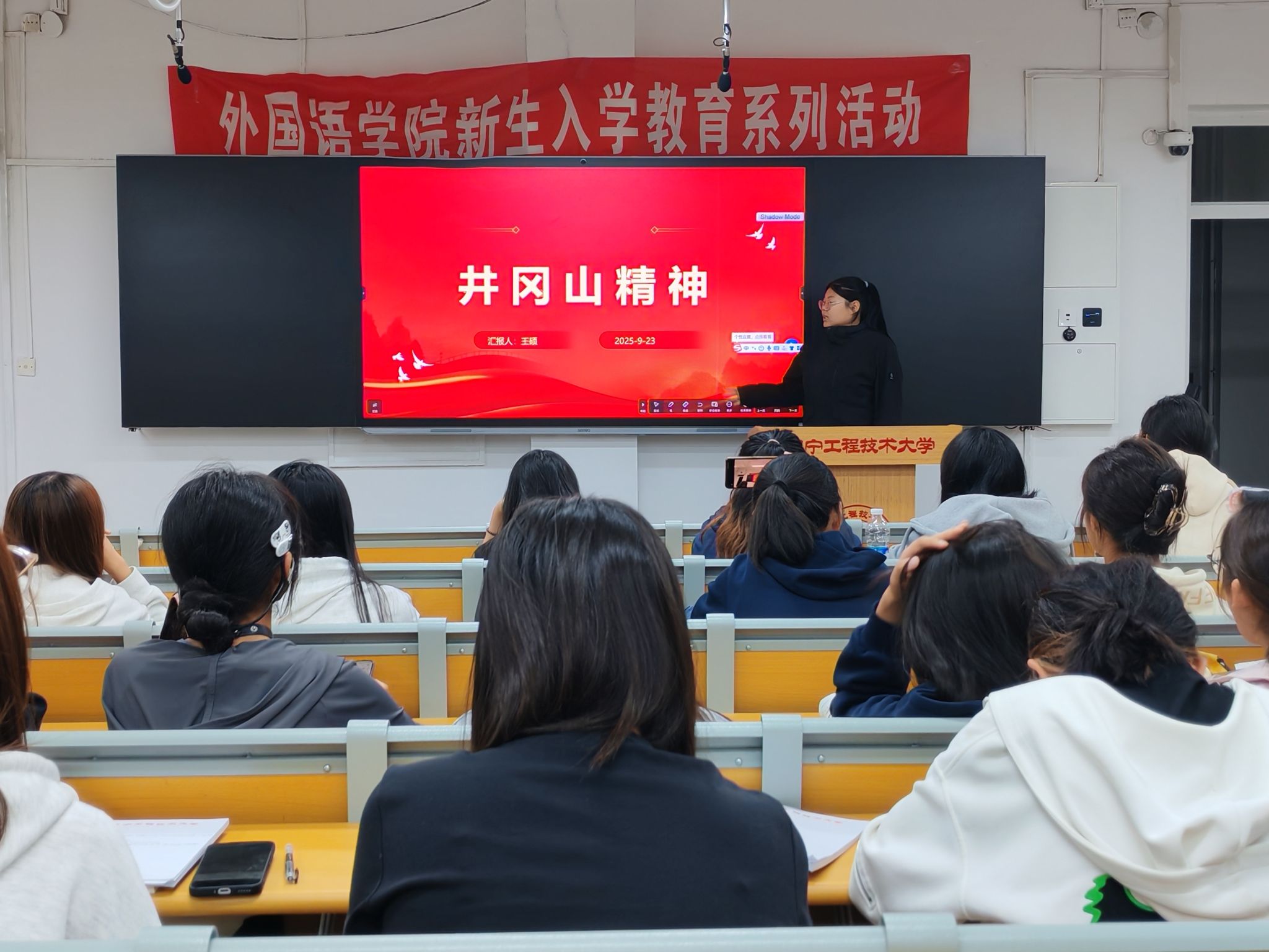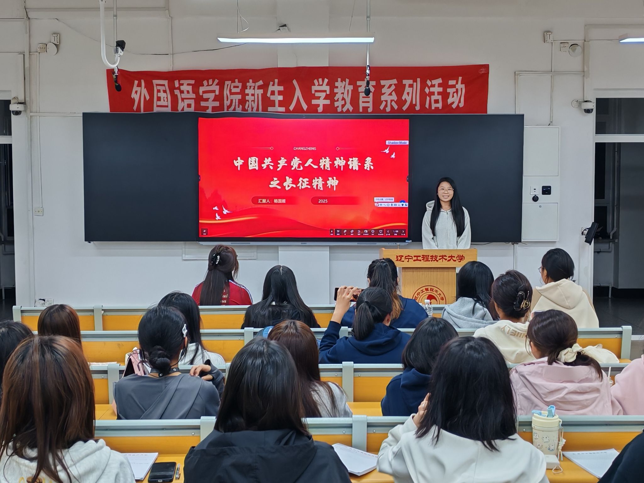 为引导广大学生深入了解、学习中国共产党人精神谱系,将红色精神力量融入外语专业实践与学习,学院于9月23日在新华楼203举办了“传承历史血脉 铭记红色初心”共产党人精神谱系宣讲会,本次活动由院学生工作部主办,学院共产党人精神谱系宣讲团成团英语22-2班杨圆媛、英语23-2班王硕、英语23-3班石烁涵、英语23-3班田秋歌主讲,2025级全体学生参加。